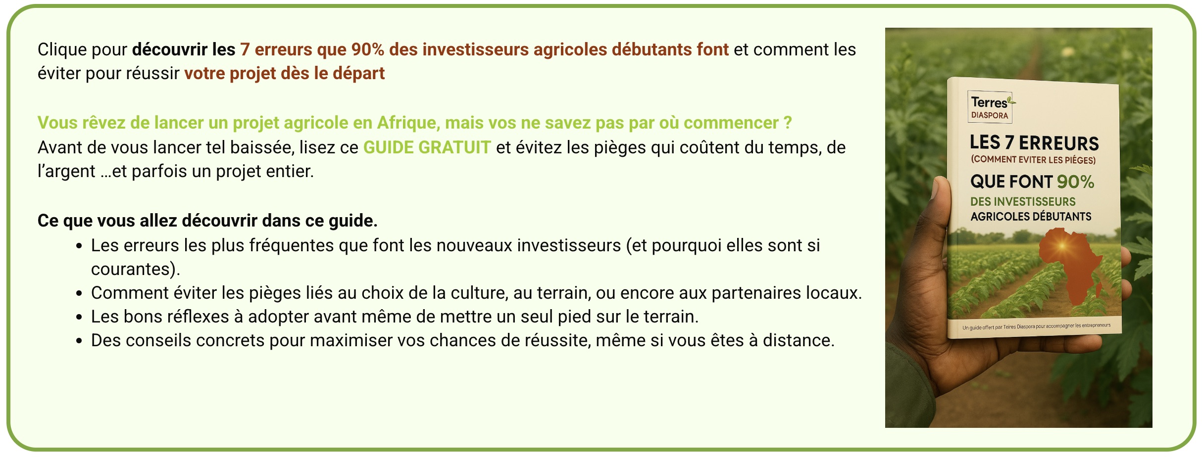 Avant d’investir, lis ce guide gratuit : « Les 7 erreurs que font 90 % des investisseurs agricoles débutants« , tu éviteras des pièges fréquents et gagneras un temps précieux.